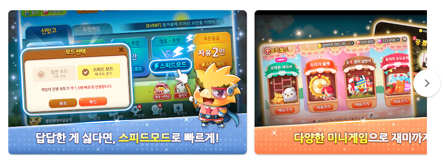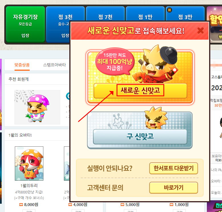 그리고 앞에서 했던 것처럼 중간에 있는 '경기장' 부분에 본인이 들어가고 싶은 경기장을 선택하고 나면, 이런 식에 새 창을 볼 수 있어요. 여기서 새로운 신맞고 혹은 구 신맞고 중에 하나를 선택하는데, 대부분은 위에 있는 '새로운 신맞고'를 보는 경우가 많더라구요.