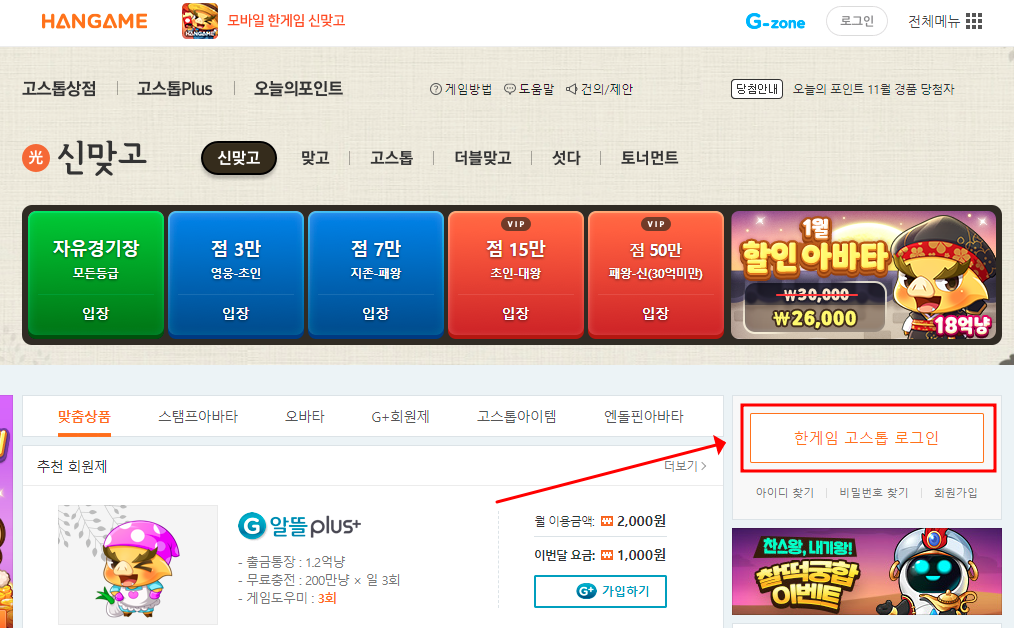 그리고 나면 다음 페이지에 이렇게 한게임 맞고의 기본 홈화면이 보이게 되요. 여기엔 게임 아바타, 혹은 고스톱 아이템 등에 대한 정보등을 확인할 수 있는데요. 여기서 우선 다른것 말고 오른쪽에서 '한게임 고스톱 로그인' 버튼을 눌러서 한게임 계정 로그인을 해보세요.