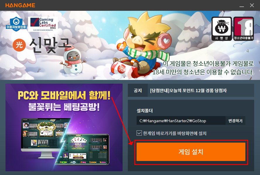 이를 클릭하고 나면, (한게임 게임을 한번도 설치하지 않은 분들은) 이런 식에 '한스타터2 다운로드' 창이 뜰 수 있어요. 여기서 다운로드를 누르고 설치 파일을 받고, 다시금 클릭하면 이런 식에 설치 창이 나옵니다. 여기서 설치 폴더를 확인한 다음, 우측 아래에 있는 '게임 설치' 버튼을 누르면 본격적인 게임 설치가 시작 될꺼에요. 그 다음에 신맞고 게임을 하시면 됩니다.
