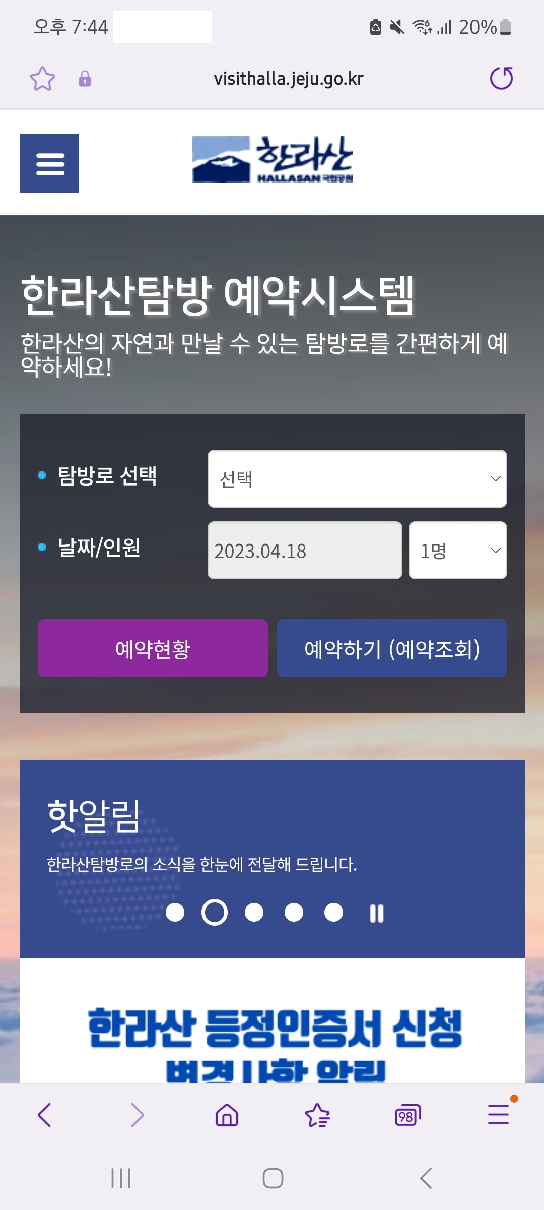 기타 이런 탐방은 '모바일 기기'에서도 할 수 있는데요. 스마트폰을 통해 한라산탐방 예약시스템 홈페이지(바로가기)를 검색해 들어가신 다음, 초기 화면에서 탐방로 선택, 날짜, 인원 등을 선택하고 '예약하기' 버튼을 누르면 예약을 진행하실 수 있을꺼에요.